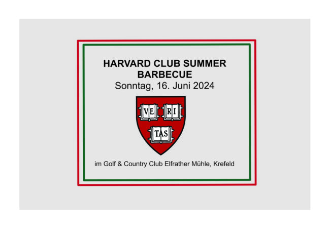 HARVARD CLUB SUMMER BARBECUE 2024 Der Harvard Club Rhein-Ruhr und der Golf & Country Club Elfrather Mühle laden zum vierten Mal zum deutsch-amerikanischen Austausch und Familien Sommerfest 2024 am Sonntag, den 16. Juni 2024 ein. Ehrengast ist Generalkonsulin Pauline Kao vom US-Generalkonsulat Düsseldorf. Preis für das Catering beträgt 45,50 Euro exklusive Getränke. Freuen Sie sich…